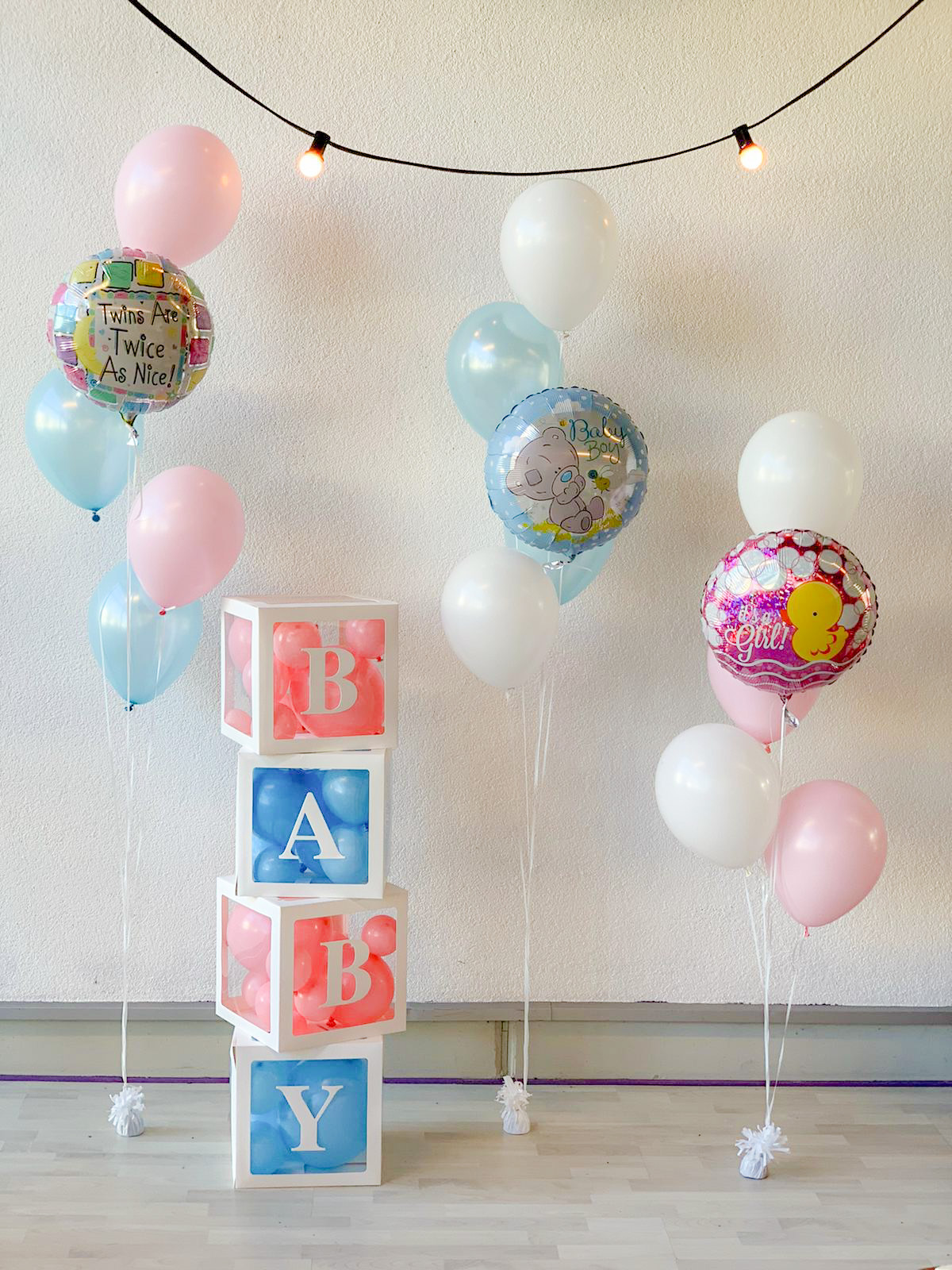 Van babyspenen, ballonpilaren en ballon baby’s in roze of blauw, tot heliumballonnen met confetti in blauw of roze, wij leveren graag prachtige ballondecoraties om jullie feestje net een extra vloeibare tintje te geven! Maar ook een leuke babywand van ballonnen of een speciaal baby heliumtrosje ballonnen staat super verloop.